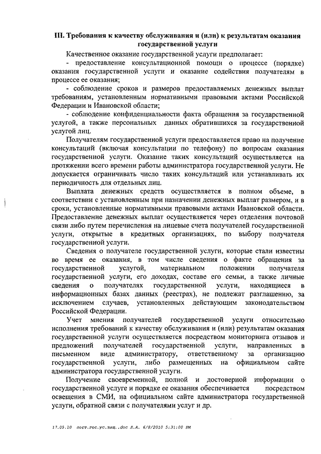 Постановление Правительства Ивановской области от 02.06.2010 N 182-п "Об утверждении стандартов качества государственных услуг Ивановской области в сфере социальной защиты населения" (вместе со "Стандартом качества государственной услуги Ивановской области "Организация предоставления компенсационных выплат гражданам, которым причинен ущерб на финансовом и фондовом рынках Ивановской области", "Стандартом качества государственной услуги "Организация дополнительного пенсионного обеспечения отдельных категорий граждан", "Стандартом качества государственной услуги Ивановской области "Погребение отдельных категорий умерших (которые не работали и не являлись пенсионерами, а также детей, родившихся мертвыми по истечении 196 дней беременности) при отсутствии лиц, взявших на себя обязательства по погребению", "Стандартом качества государственной услуги Ивановской области "Организация социальной работы с семьями и детьми", "Стандартом качества государственной услуги Ивановской области "Содержание, воспитание и начальное профессиональное образование инвалидов и лиц, страдающих хроническими формами заболеваний, в стационарных и полустационарных условиях", "Стандартом качества государственной услуги Ивановской области "Адресная социальная помощь отдельным категориям граждан", "Стандартом качества государственной услуги Ивановской области "Социальное обслуживание граждан пожилого возраста, инвалидов и детей, страдающих хроническими формами заболеваний, в стационарных и полустационарных условиях", "Стандартом качества государственной услуги Ивановской области "Социальное обслуживание лиц без определенного места жительства и занятий в стационарных и полустационарных условиях", "Стандартом качества государственной услуги Ивановской области "Социальное обслуживание граждан пожилого возраста и инвалидов на дому", "Стандартом качества государственной услуги Ивановской области "Временное содержание и социальная реабилитация несовершеннолетних, находящихся в трудной жизненной ситуации", "Стандартом качества государственной услуги Ивановской области "Выдача социальной карты жителя Ивановской области", "Стандартом качества государственной услуги Ивановской области "Организация социальной поддержки отдельных категорий граждан в форме социальных выплат, компенсаций и субсидий", "Стандартом качества государственной услуги Ивановской области "Организация денежных выплат при всех формах устройства в семью детей-сирот и детей, оставшихся без попечения родителей", "Стандартом качества государственной услуги Ивановской области "Оформление и выдача удостоверений гражданам, пострадавшим от радиационного воздействия", "Стандартом качества государственной услуги Ивановской области "Содержание, воспитание и общее образование детей-сирот, детей, оставшихся без попечения родителей, и временное (до одного года) содержание, воспитание и общее образование детей одиноких матерей (отцов), а также детей безработных, беженцев, вынужденных переселенцев, а также из семей, пострадавших от стихийных бедствий и не имеющих постоянного места жительства, в условиях круглосуточного стационара", "Стандартом качества государственной услуги Ивановской области "Назначение опекуна (попечителя) совершеннолетним гражданам, нуждающимся в о