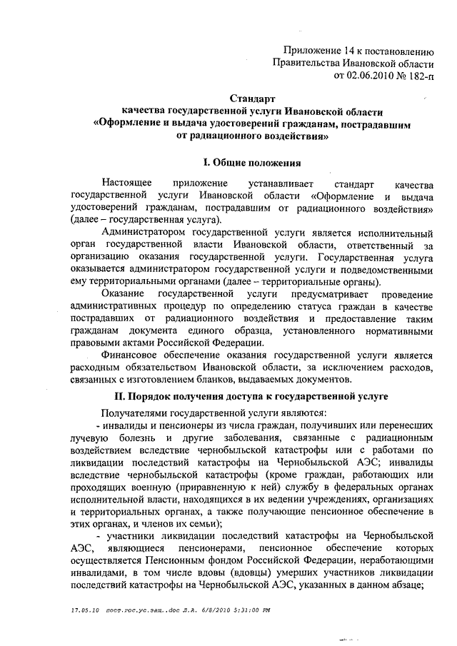 Постановление Правительства Ивановской области от 02.06.2010 N 182-п "Об утверждении стандартов качества государственных услуг Ивановской области в сфере социальной защиты населения" (вместе со "Стандартом качества государственной услуги Ивановской области "Организация предоставления компенсационных выплат гражданам, которым причинен ущерб на финансовом и фондовом рынках Ивановской области", "Стандартом качества государственной услуги "Организация дополнительного пенсионного обеспечения отдельных категорий граждан", "Стандартом качества государственной услуги Ивановской области "Погребение отдельных категорий умерших (которые не работали и не являлись пенсионерами, а также детей, родившихся мертвыми по истечении 196 дней беременности) при отсутствии лиц, взявших на себя обязательства по погребению", "Стандартом качества государственной услуги Ивановской области "Организация социальной работы с семьями и детьми", "Стандартом качества государственной услуги Ивановской области "Содержание, воспитание и начальное профессиональное образование инвалидов и лиц, страдающих хроническими формами заболеваний, в стационарных и полустационарных условиях", "Стандартом качества государственной услуги Ивановской области "Адресная социальная помощь отдельным категориям граждан", "Стандартом качества государственной услуги Ивановской области "Социальное обслуживание граждан пожилого возраста, инвалидов и детей, страдающих хроническими формами заболеваний, в стационарных и полустационарных условиях", "Стандартом качества государственной услуги Ивановской области "Социальное обслуживание лиц без определенного места жительства и занятий в стационарных и полустационарных условиях", "Стандартом качества государственной услуги Ивановской области "Социальное обслуживание граждан пожилого возраста и инвалидов на дому", "Стандартом качества государственной услуги Ивановской области "Временное содержание и социальная реабилитация несовершеннолетних, находящихся в трудной жизненной ситуации", "Стандартом качества государственной услуги Ивановской области "Выдача социальной карты жителя Ивановской области", "Стандартом качества государственной услуги Ивановской области "Организация социальной поддержки отдельных категорий граждан в форме социальных выплат, компенсаций и субсидий", "Стандартом качества государственной услуги Ивановской области "Организация денежных выплат при всех формах устройства в семью детей-сирот и детей, оставшихся без попечения родителей", "Стандартом качества государственной услуги Ивановской области "Оформление и выдача удостоверений гражданам, пострадавшим от радиационного воздействия", "Стандартом качества государственной услуги Ивановской области "Содержание, воспитание и общее образование детей-сирот, детей, оставшихся без попечения родителей, и временное (до одного года) содержание, воспитание и общее образование детей одиноких матерей (отцов), а также детей безработных, беженцев, вынужденных переселенцев, а также из семей, пострадавших от стихийных бедствий и не имеющих постоянного места жительства, в условиях круглосуточного стационара", "Стандартом качества государственной услуги Ивановской области "Назначение опекуна (попечителя) совершеннолетним гражданам, нуждающимся в о