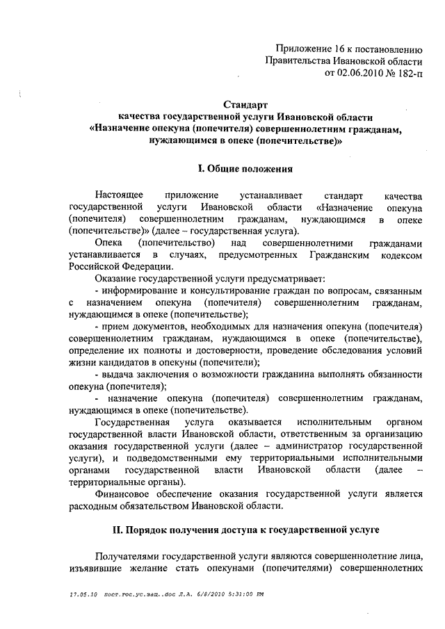 Постановление Правительства Ивановской области от 02.06.2010 N 182-п "Об утверждении стандартов качества государственных услуг Ивановской области в сфере социальной защиты населения" (вместе со "Стандартом качества государственной услуги Ивановской области "Организация предоставления компенсационных выплат гражданам, которым причинен ущерб на финансовом и фондовом рынках Ивановской области", "Стандартом качества государственной услуги "Организация дополнительного пенсионного обеспечения отдельных категорий граждан", "Стандартом качества государственной услуги Ивановской области "Погребение отдельных категорий умерших (которые не работали и не являлись пенсионерами, а также детей, родившихся мертвыми по истечении 196 дней беременности) при отсутствии лиц, взявших на себя обязательства по погребению", "Стандартом качества государственной услуги Ивановской области "Организация социальной работы с семьями и детьми", "Стандартом качества государственной услуги Ивановской области "Содержание, воспитание и начальное профессиональное образование инвалидов и лиц, страдающих хроническими формами заболеваний, в стационарных и полустационарных условиях", "Стандартом качества государственной услуги Ивановской области "Адресная социальная помощь отдельным категориям граждан", "Стандартом качества государственной услуги Ивановской области "Социальное обслуживание граждан пожилого возраста, инвалидов и детей, страдающих хроническими формами заболеваний, в стационарных и полустационарных условиях", "Стандартом качества государственной услуги Ивановской области "Социальное обслуживание лиц без определенного места жительства и занятий в стационарных и полустационарных условиях", "Стандартом качества государственной услуги Ивановской области "Социальное обслуживание граждан пожилого возраста и инвалидов на дому", "Стандартом качества государственной услуги Ивановской области "Временное содержание и социальная реабилитация несовершеннолетних, находящихся в трудной жизненной ситуации", "Стандартом качества государственной услуги Ивановской области "Выдача социальной карты жителя Ивановской области", "Стандартом качества государственной услуги Ивановской области "Организация социальной поддержки отдельных категорий граждан в форме социальных выплат, компенсаций и субсидий", "Стандартом качества государственной услуги Ивановской области "Организация денежных выплат при всех формах устройства в семью детей-сирот и детей, оставшихся без попечения родителей", "Стандартом качества государственной услуги Ивановской области "Оформление и выдача удостоверений гражданам, пострадавшим от радиационного воздействия", "Стандартом качества государственной услуги Ивановской области "Содержание, воспитание и общее образование детей-сирот, детей, оставшихся без попечения родителей, и временное (до одного года) содержание, воспитание и общее образование детей одиноких матерей (отцов), а также детей безработных, беженцев, вынужденных переселенцев, а также из семей, пострадавших от стихийных бедствий и не имеющих постоянного места жительства, в условиях круглосуточного стационара", "Стандартом качества государственной услуги Ивановской области "Назначение опекуна (попечителя) совершеннолетним гражданам, нуждающимся в о
