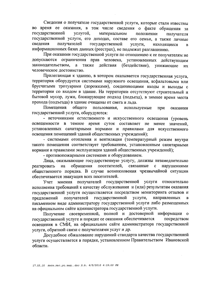 Постановление Правительства Ивановской области от 02.06.2010 N 182-п "Об утверждении стандартов качества государственных услуг Ивановской области в сфере социальной защиты населения" (вместе со "Стандартом качества государственной услуги Ивановской области "Организация предоставления компенсационных выплат гражданам, которым причинен ущерб на финансовом и фондовом рынках Ивановской области", "Стандартом качества государственной услуги "Организация дополнительного пенсионного обеспечения отдельных категорий граждан", "Стандартом качества государственной услуги Ивановской области "Погребение отдельных категорий умерших (которые не работали и не являлись пенсионерами, а также детей, родившихся мертвыми по истечении 196 дней беременности) при отсутствии лиц, взявших на себя обязательства по погребению", "Стандартом качества государственной услуги Ивановской области "Организация социальной работы с семьями и детьми", "Стандартом качества государственной услуги Ивановской области "Содержание, воспитание и начальное профессиональное образование инвалидов и лиц, страдающих хроническими формами заболеваний, в стационарных и полустационарных условиях", "Стандартом качества государственной услуги Ивановской области "Адресная социальная помощь отдельным категориям граждан", "Стандартом качества государственной услуги Ивановской области "Социальное обслуживание граждан пожилого возраста, инвалидов и детей, страдающих хроническими формами заболеваний, в стационарных и полустационарных условиях", "Стандартом качества государственной услуги Ивановской области "Социальное обслуживание лиц без определенного места жительства и занятий в стационарных и полустационарных условиях", "Стандартом качества государственной услуги Ивановской области "Социальное обслуживание граждан пожилого возраста и инвалидов на дому", "Стандартом качества государственной услуги Ивановской области "Временное содержание и социальная реабилитация несовершеннолетних, находящихся в трудной жизненной ситуации", "Стандартом качества государственной услуги Ивановской области "Выдача социальной карты жителя Ивановской области", "Стандартом качества государственной услуги Ивановской области "Организация социальной поддержки отдельных категорий граждан в форме социальных выплат, компенсаций и субсидий", "Стандартом качества государственной услуги Ивановской области "Организация денежных выплат при всех формах устройства в семью детей-сирот и детей, оставшихся без попечения родителей", "Стандартом качества государственной услуги Ивановской области "Оформление и выдача удостоверений гражданам, пострадавшим от радиационного воздействия", "Стандартом качества государственной услуги Ивановской области "Содержание, воспитание и общее образование детей-сирот, детей, оставшихся без попечения родителей, и временное (до одного года) содержание, воспитание и общее образование детей одиноких матерей (отцов), а также детей безработных, беженцев, вынужденных переселенцев, а также из семей, пострадавших от стихийных бедствий и не имеющих постоянного места жительства, в условиях круглосуточного стационара", "Стандартом качества государственной услуги Ивановской области "Назначение опекуна (попечителя) совершеннолетним гражданам, нуждающимся в о
