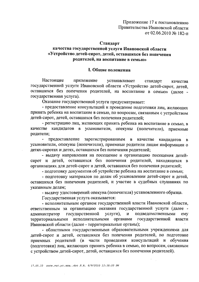 Постановление Правительства Ивановской области от 02.06.2010 N 182-п "Об утверждении стандартов качества государственных услуг Ивановской области в сфере социальной защиты населения" (вместе со "Стандартом качества государственной услуги Ивановской области "Организация предоставления компенсационных выплат гражданам, которым причинен ущерб на финансовом и фондовом рынках Ивановской области", "Стандартом качества государственной услуги "Организация дополнительного пенсионного обеспечения отдельных категорий граждан", "Стандартом качества государственной услуги Ивановской области "Погребение отдельных категорий умерших (которые не работали и не являлись пенсионерами, а также детей, родившихся мертвыми по истечении 196 дней беременности) при отсутствии лиц, взявших на себя обязательства по погребению", "Стандартом качества государственной услуги Ивановской области "Организация социальной работы с семьями и детьми", "Стандартом качества государственной услуги Ивановской области "Содержание, воспитание и начальное профессиональное образование инвалидов и лиц, страдающих хроническими формами заболеваний, в стационарных и полустационарных условиях", "Стандартом качества государственной услуги Ивановской области "Адресная социальная помощь отдельным категориям граждан", "Стандартом качества государственной услуги Ивановской области "Социальное обслуживание граждан пожилого возраста, инвалидов и детей, страдающих хроническими формами заболеваний, в стационарных и полустационарных условиях", "Стандартом качества государственной услуги Ивановской области "Социальное обслуживание лиц без определенного места жительства и занятий в стационарных и полустационарных условиях", "Стандартом качества государственной услуги Ивановской области "Социальное обслуживание граждан пожилого возраста и инвалидов на дому", "Стандартом качества государственной услуги Ивановской области "Временное содержание и социальная реабилитация несовершеннолетних, находящихся в трудной жизненной ситуации", "Стандартом качества государственной услуги Ивановской области "Выдача социальной карты жителя Ивановской области", "Стандартом качества государственной услуги Ивановской области "Организация социальной поддержки отдельных категорий граждан в форме социальных выплат, компенсаций и субсидий", "Стандартом качества государственной услуги Ивановской области "Организация денежных выплат при всех формах устройства в семью детей-сирот и детей, оставшихся без попечения родителей", "Стандартом качества государственной услуги Ивановской области "Оформление и выдача удостоверений гражданам, пострадавшим от радиационного воздействия", "Стандартом качества государственной услуги Ивановской области "Содержание, воспитание и общее образование детей-сирот, детей, оставшихся без попечения родителей, и временное (до одного года) содержание, воспитание и общее образование детей одиноких матерей (отцов), а также детей безработных, беженцев, вынужденных переселенцев, а также из семей, пострадавших от стихийных бедствий и не имеющих постоянного места жительства, в условиях круглосуточного стационара", "Стандартом качества государственной услуги Ивановской области "Назначение опекуна (попечителя) совершеннолетним гражданам, нуждающимся в о
