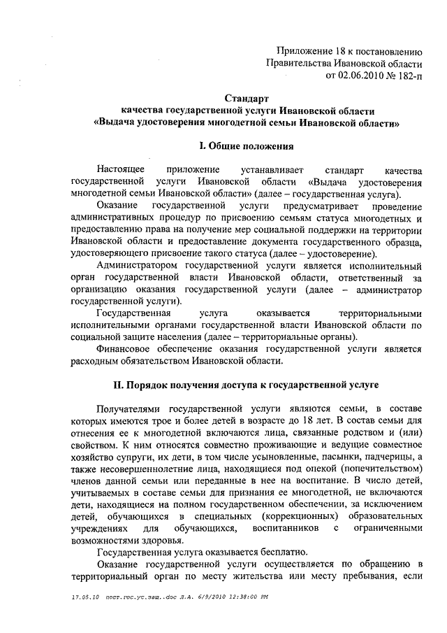 Постановление Правительства Ивановской области от 02.06.2010 N 182-п "Об утверждении стандартов качества государственных услуг Ивановской области в сфере социальной защиты населения" (вместе со "Стандартом качества государственной услуги Ивановской области "Организация предоставления компенсационных выплат гражданам, которым причинен ущерб на финансовом и фондовом рынках Ивановской области", "Стандартом качества государственной услуги "Организация дополнительного пенсионного обеспечения отдельных категорий граждан", "Стандартом качества государственной услуги Ивановской области "Погребение отдельных категорий умерших (которые не работали и не являлись пенсионерами, а также детей, родившихся мертвыми по истечении 196 дней беременности) при отсутствии лиц, взявших на себя обязательства по погребению", "Стандартом качества государственной услуги Ивановской области "Организация социальной работы с семьями и детьми", "Стандартом качества государственной услуги Ивановской области "Содержание, воспитание и начальное профессиональное образование инвалидов и лиц, страдающих хроническими формами заболеваний, в стационарных и полустационарных условиях", "Стандартом качества государственной услуги Ивановской области "Адресная социальная помощь отдельным категориям граждан", "Стандартом качества государственной услуги Ивановской области "Социальное обслуживание граждан пожилого возраста, инвалидов и детей, страдающих хроническими формами заболеваний, в стационарных и полустационарных условиях", "Стандартом качества государственной услуги Ивановской области "Социальное обслуживание лиц без определенного места жительства и занятий в стационарных и полустационарных условиях", "Стандартом качества государственной услуги Ивановской области "Социальное обслуживание граждан пожилого возраста и инвалидов на дому", "Стандартом качества государственной услуги Ивановской области "Временное содержание и социальная реабилитация несовершеннолетних, находящихся в трудной жизненной ситуации", "Стандартом качества государственной услуги Ивановской области "Выдача социальной карты жителя Ивановской области", "Стандартом качества государственной услуги Ивановской области "Организация социальной поддержки отдельных категорий граждан в форме социальных выплат, компенсаций и субсидий", "Стандартом качества государственной услуги Ивановской области "Организация денежных выплат при всех формах устройства в семью детей-сирот и детей, оставшихся без попечения родителей", "Стандартом качества государственной услуги Ивановской области "Оформление и выдача удостоверений гражданам, пострадавшим от радиационного воздействия", "Стандартом качества государственной услуги Ивановской области "Содержание, воспитание и общее образование детей-сирот, детей, оставшихся без попечения родителей, и временное (до одного года) содержание, воспитание и общее образование детей одиноких матерей (отцов), а также детей безработных, беженцев, вынужденных переселенцев, а также из семей, пострадавших от стихийных бедствий и не имеющих постоянного места жительства, в условиях круглосуточного стационара", "Стандартом качества государственной услуги Ивановской области "Назначение опекуна (попечителя) совершеннолетним гражданам, нуждающимся в о