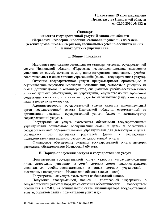 Постановление Правительства Ивановской области от 02.06.2010 N 182-п "Об утверждении стандартов качества государственных услуг Ивановской области в сфере социальной защиты населения" (вместе со "Стандартом качества государственной услуги Ивановской области "Организация предоставления компенсационных выплат гражданам, которым причинен ущерб на финансовом и фондовом рынках Ивановской области", "Стандартом качества государственной услуги "Организация дополнительного пенсионного обеспечения отдельных категорий граждан", "Стандартом качества государственной услуги Ивановской области "Погребение отдельных категорий умерших (которые не работали и не являлись пенсионерами, а также детей, родившихся мертвыми по истечении 196 дней беременности) при отсутствии лиц, взявших на себя обязательства по погребению", "Стандартом качества государственной услуги Ивановской области "Организация социальной работы с семьями и детьми", "Стандартом качества государственной услуги Ивановской области "Содержание, воспитание и начальное профессиональное образование инвалидов и лиц, страдающих хроническими формами заболеваний, в стационарных и полустационарных условиях", "Стандартом качества государственной услуги Ивановской области "Адресная социальная помощь отдельным категориям граждан", "Стандартом качества государственной услуги Ивановской области "Социальное обслуживание граждан пожилого возраста, инвалидов и детей, страдающих хроническими формами заболеваний, в стационарных и полустационарных условиях", "Стандартом качества государственной услуги Ивановской области "Социальное обслуживание лиц без определенного места жительства и занятий в стационарных и полустационарных условиях", "Стандартом качества государственной услуги Ивановской области "Социальное обслуживание граждан пожилого возраста и инвалидов на дому", "Стандартом качества государственной услуги Ивановской области "Временное содержание и социальная реабилитация несовершеннолетних, находящихся в трудной жизненной ситуации", "Стандартом качества государственной услуги Ивановской области "Выдача социальной карты жителя Ивановской области", "Стандартом качества государственной услуги Ивановской области "Организация социальной поддержки отдельных категорий граждан в форме социальных выплат, компенсаций и субсидий", "Стандартом качества государственной услуги Ивановской области "Организация денежных выплат при всех формах устройства в семью детей-сирот и детей, оставшихся без попечения родителей", "Стандартом качества государственной услуги Ивановской области "Оформление и выдача удостоверений гражданам, пострадавшим от радиационного воздействия", "Стандартом качества государственной услуги Ивановской области "Содержание, воспитание и общее образование детей-сирот, детей, оставшихся без попечения родителей, и временное (до одного года) содержание, воспитание и общее образование детей одиноких матерей (отцов), а также детей безработных, беженцев, вынужденных переселенцев, а также из семей, пострадавших от стихийных бедствий и не имеющих постоянного места жительства, в условиях круглосуточного стационара", "Стандартом качества государственной услуги Ивановской области "Назначение опекуна (попечителя) совершеннолетним гражданам, нуждающимся в о