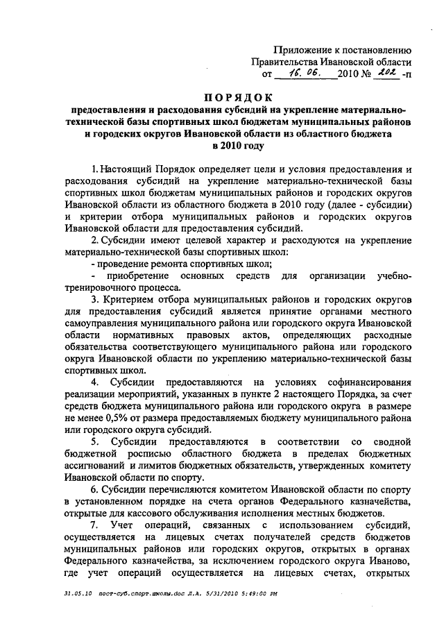 Постановление Правительства Ивановской области от 16.06.2010 N 202-п "Об утверждении Порядка предоставления и расходования субсидий на укрепление материально-технической базы спортивных школ бюджетам муниципальных районов и городских округов Ивановской области из областного бюджета в 2010 году"