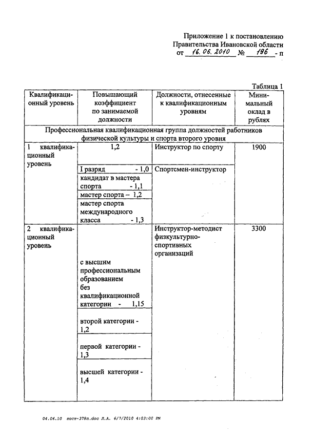 Постановление Правительства Ивановской области от 16.06.2010 N 196-п "О внесении изменений в постановление Правительства Ивановской области от 31.12.2008 N 378-п "О системе оплаты труда работников государственных образовательных учреждений Ивановской области, подведомственных комитету Ивановской области по спорту"