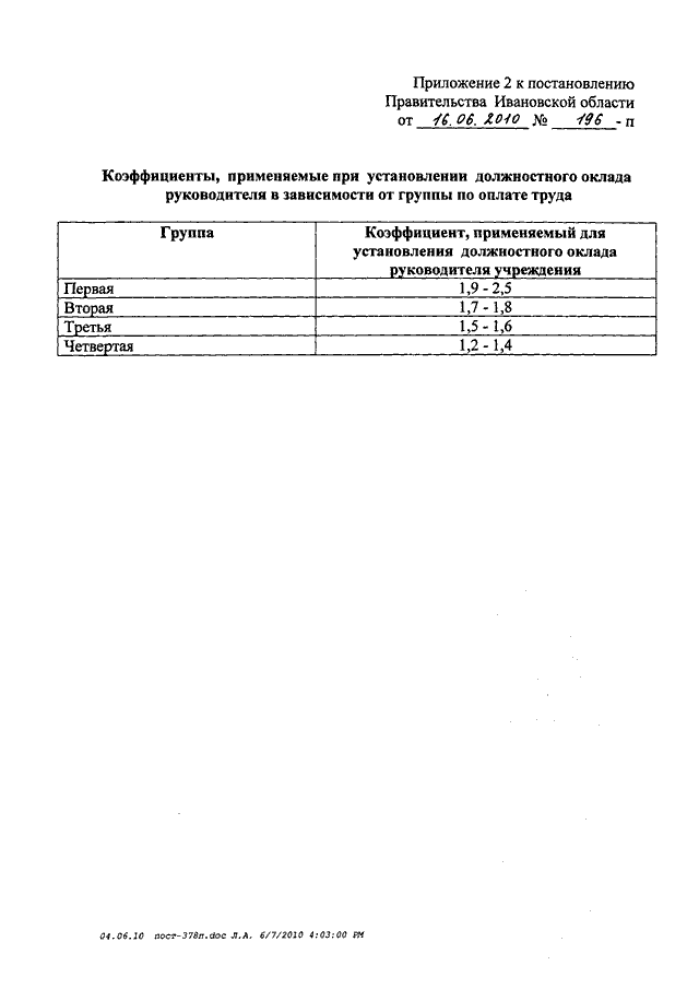 Постановление Правительства Ивановской области от 16.06.2010 N 196-п "О внесении изменений в постановление Правительства Ивановской области от 31.12.2008 N 378-п "О системе оплаты труда работников государственных образовательных учреждений Ивановской области, подведомственных комитету Ивановской области по спорту"