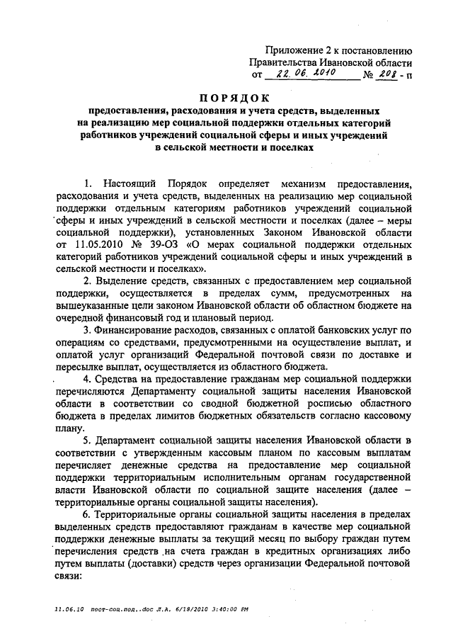 Постановление Правительства Ивановской области от 22.06.2010 N 208-п "Об утверждении Порядка предоставления мер социальной поддержки отдельным категориям работников учреждений социальной сферы и иных учреждений в сельской местности и поселках и Порядка предоставления, расходования и учета средств, выделенных на реализацию мер социальной поддержки отдельных категорий работников учреждений социальной сферы и иных учреждений в сельской местности и поселках"