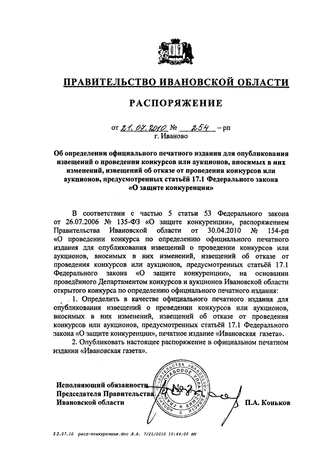 Распоряжение Правительства Ивановской области от 21.07.2010 N 254-рп "Об определении официального печатного издания для опубликования извещений о проведении конкурсов или аукционов, вносимых в них изменений, извещений об отказе от проведения конкурсов или аукционов, предусмотренных статьей 17.1 Федерального закона "О защите конкуренции"