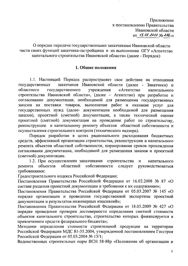 Постановление Правительства Ивановской области от 13.08.2010 N 286-п "О порядке передачи государственными заказчиками Ивановской области части своих функций заказчика-застройщика и их выполнения ОГУ "Агентство капитального строительства Ивановской области"