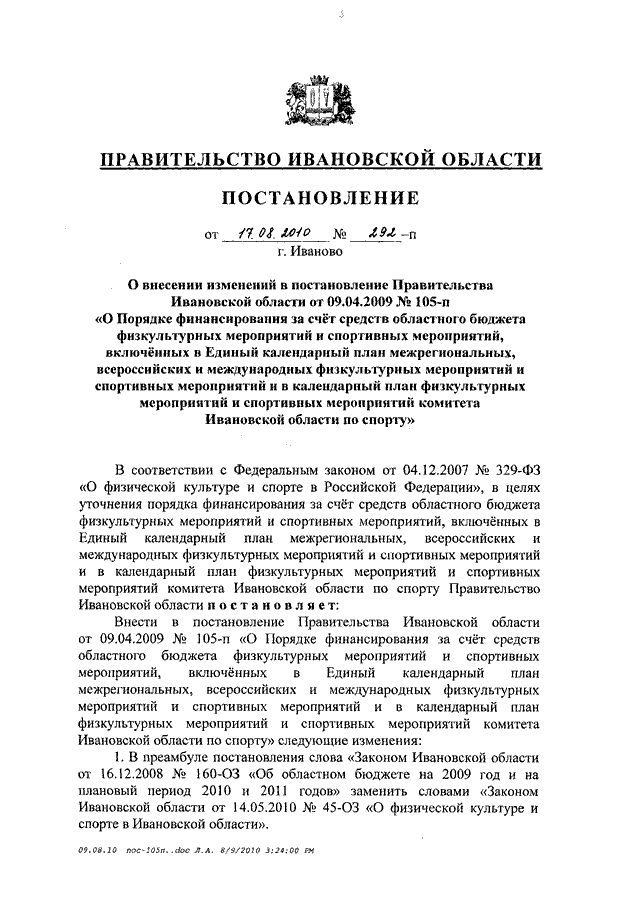 Постановление Правительства Ивановской области от 17.08.2010 N 292-п "О внесении изменений в постановление Правительства Ивановской области от 09.04.2009 N 105-п "О Порядке финансирования за счет средств областного бюджета физкультурных мероприятий и спортивных мероприятий, включенных в Единый календарный план межрегиональных, всероссийских и международных физкультурных мероприятий и спортивных мероприятий и в календарный план физкультурных мероприятий и спортивных мероприятий комитета Ивановской области по спорту"