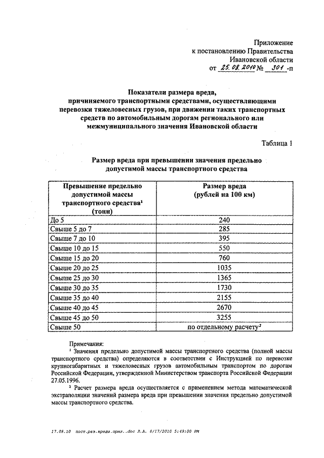 Постановление Правительства Ивановской области от 25.08.2010 N 301-п "Об определении размера вреда, причиняемого транспортными средствами, осуществляющими перевозки тяжеловесных грузов, при движении таких транспортных средств по автомобильным дорогам регионального или межмуниципального значения Ивановской области"