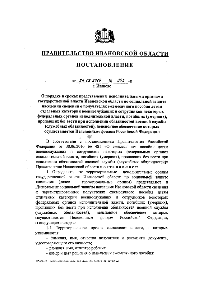 Постановление Правительства Ивановской области от 25.08.2010 N 302-п "О порядке и сроках представления исполнительными органами государственной власти Ивановской области по социальной защите населения сведений о получателях ежемесячного пособия детям отдельных категорий военнослужащих и сотрудников некоторых федеральных органов исполнительной власти, погибших (умерших), пропавших без вести при исполнении обязанностей военной службы (служебных обязанностей), пенсионное обеспечение которых осуществляется Пенсионным фондом Российской Федерации"