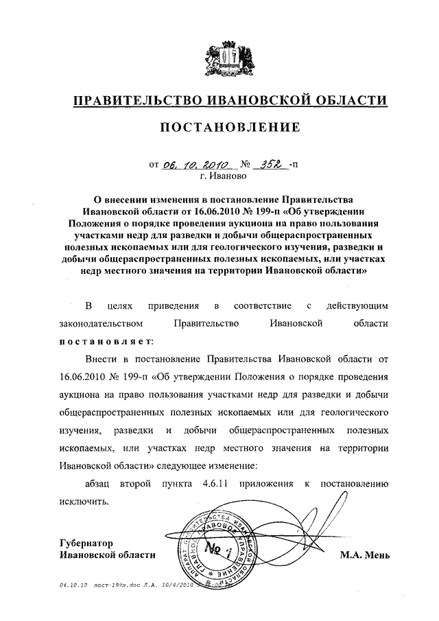 Постановление Правительства Ивановской области от 06.10.2010 N 352-п "О внесении изменения в постановление Правительства Ивановской области от 16.06.2010 N 199-п "Об утверждении Положения о порядке проведения аукциона на право пользования участками недр для разведки и добычи общераспространенных полезных ископаемых или для геологического изучения, разведки и добычи общераспространенных полезных ископаемых, или участках недр местного значения на территории Ивановской области"