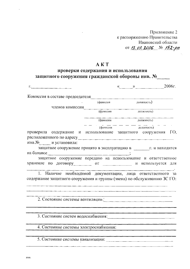 Распоряжение Правительства Ивановской области от 13.07.2006 N 152-рп "Об организации проведения инвентаризации защитных сооружений гражданской обороны Ивановской области" (вместе с "Методическими рекомендациями по проведению инвентаризации защитных сооружений гражданской обороны на территории Ивановской области")