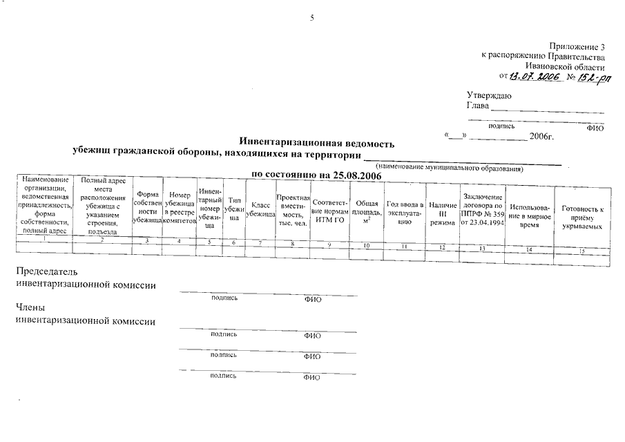 Распоряжение Правительства Ивановской области от 13.07.2006 N 152-рп "Об организации проведения инвентаризации защитных сооружений гражданской обороны Ивановской области" (вместе с "Методическими рекомендациями по проведению инвентаризации защитных сооружений гражданской обороны на территории Ивановской области")