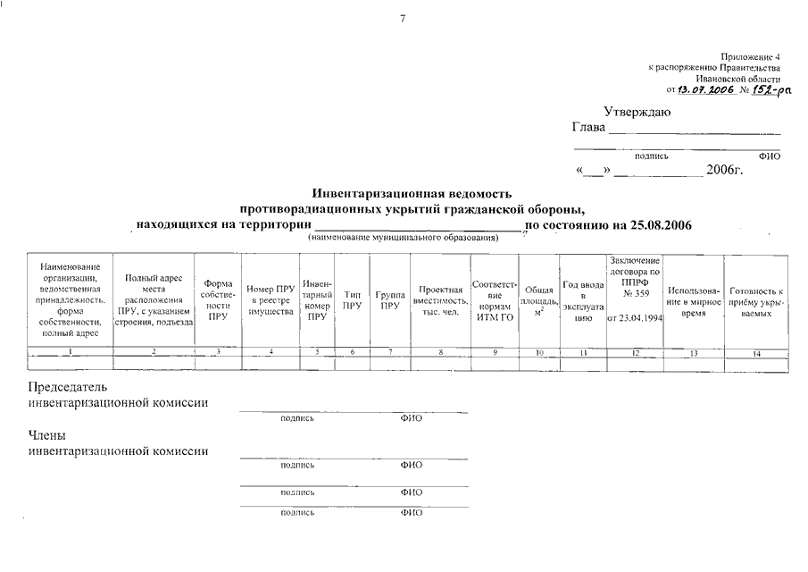Распоряжение Правительства Ивановской области от 13.07.2006 N 152-рп "Об организации проведения инвентаризации защитных сооружений гражданской обороны Ивановской области" (вместе с "Методическими рекомендациями по проведению инвентаризации защитных сооружений гражданской обороны на территории Ивановской области")