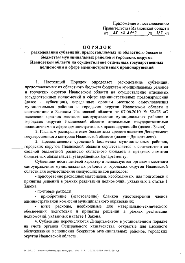 Постановление Правительства Ивановской области от 25.10.2010 N 377-п "Об утверждении Порядка расходования субвенций, предоставляемых из областного бюджета бюджетам муниципальных районов и городских округов Ивановской области на осуществление отдельных государственных полномочий в сфере административных правонарушений"