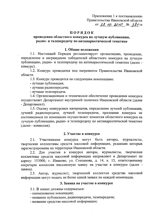 Постановление Правительства Ивановской области от 28.10.2010 N 381-п "Об областном конкурсе на лучшую публикацию, радио- и телепередачу по антинаркотической тематике" (вместе с "Порядком проведения областного конкурса на лучшую публикацию, радио- и телепередачу по антинаркотической тематике", "Положением о конкурсной комиссии областного конкурса на лучшую публикацию, радио- и телепередачу по антинаркотической тематике")