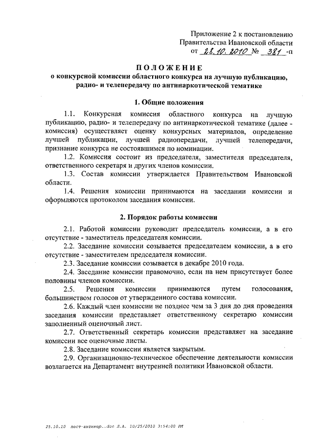 Постановление Правительства Ивановской области от 28.10.2010 N 381-п "Об областном конкурсе на лучшую публикацию, радио- и телепередачу по антинаркотической тематике" (вместе с "Порядком проведения областного конкурса на лучшую публикацию, радио- и телепередачу по антинаркотической тематике", "Положением о конкурсной комиссии областного конкурса на лучшую публикацию, радио- и телепередачу по антинаркотической тематике")