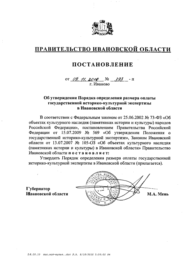 Постановление Правительства Ивановской области от 09.11.2010 N 393-п "Об утверждении Порядка определения размера оплаты государственной историко-культурной экспертизы в Ивановской области"