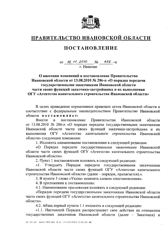 Постановление Правительства Ивановской области от 16.11.2010 N 402-п "О внесении изменений в постановление Правительства Ивановской области от 13.08.2010 N 286-п "О порядке передачи государственными заказчиками Ивановской области части своих функций заказчика-застройщика и их выполнения ОГУ "Агентство капитального строительства Ивановской области"