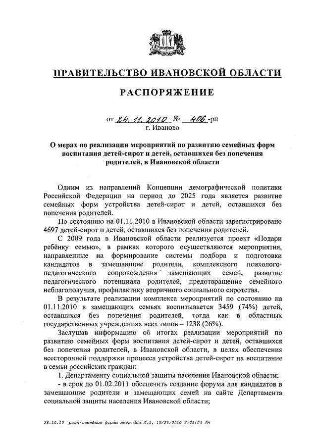 Распоряжение Правительства Ивановской области от 24.11.2010 N 406-рп "О мерах по реализации мероприятий по развитию семейных форм воспитания детей-сирот и детей, оставшихся без попечения родителей, в Ивановской области"