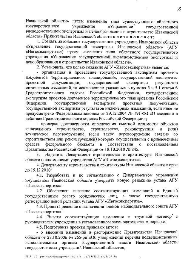 Постановление Правительства Ивановской области от 30.11.2010 N 431-п "О создании автономного государственного учреждения Ивановской области "Управление государственной экспертизы Ивановской области" путем изменения типа существующего областного государственного учреждения "Управление государственной вневедомственной экспертизы и ценообразования в строительстве Ивановской области" (вместе с "Перечнем особо ценного движимого имущества, закрепляемого на праве оперативного управления за автономным государственным учреждением Ивановской области "Управление государственной экспертизы Ивановской области", "Перечнем иного имущества, закрепляемого на праве оперативного управления за автономным государственным учреждением Ивановской области "Управление государственной экспертизы Ивановской области")