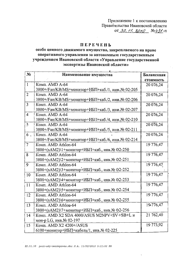 Постановление Правительства Ивановской области от 30.11.2010 N 431-п "О создании автономного государственного учреждения Ивановской области "Управление государственной экспертизы Ивановской области" путем изменения типа существующего областного государственного учреждения "Управление государственной вневедомственной экспертизы и ценообразования в строительстве Ивановской области" (вместе с "Перечнем особо ценного движимого имущества, закрепляемого на праве оперативного управления за автономным государственным учреждением Ивановской области "Управление государственной экспертизы Ивановской области", "Перечнем иного имущества, закрепляемого на праве оперативного управления за автономным государственным учреждением Ивановской области "Управление государственной экспертизы Ивановской области")