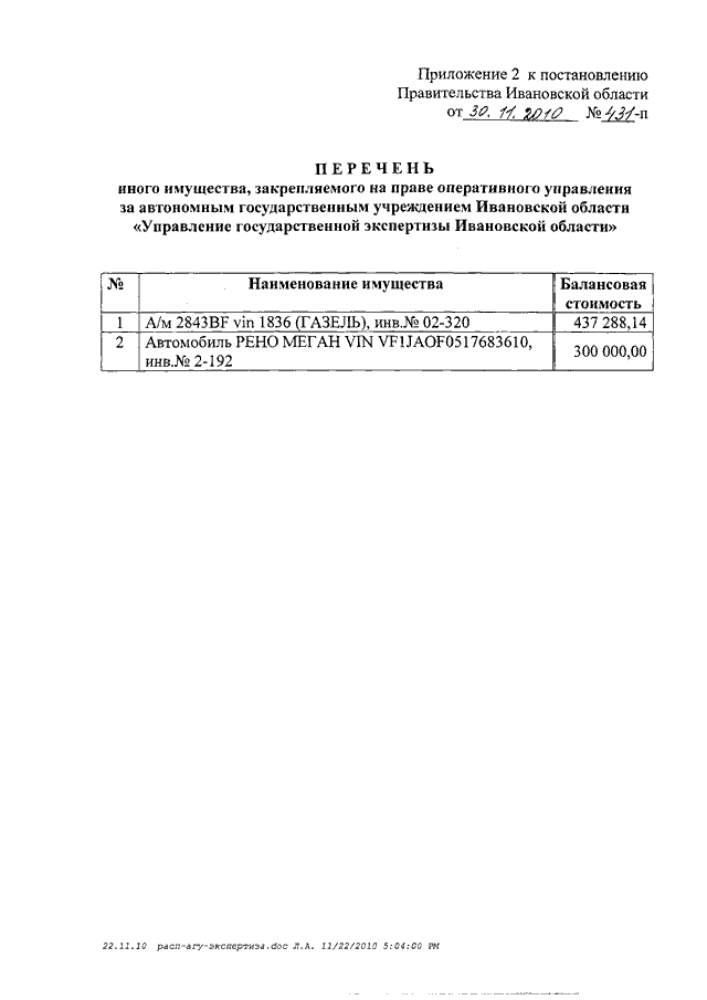 Постановление Правительства Ивановской области от 30.11.2010 N 431-п "О создании автономного государственного учреждения Ивановской области "Управление государственной экспертизы Ивановской области" путем изменения типа существующего областного государственного учреждения "Управление государственной вневедомственной экспертизы и ценообразования в строительстве Ивановской области" (вместе с "Перечнем особо ценного движимого имущества, закрепляемого на праве оперативного управления за автономным государственным учреждением Ивановской области "Управление государственной экспертизы Ивановской области", "Перечнем иного имущества, закрепляемого на праве оперативного управления за автономным государственным учреждением Ивановской области "Управление государственной экспертизы Ивановской области")