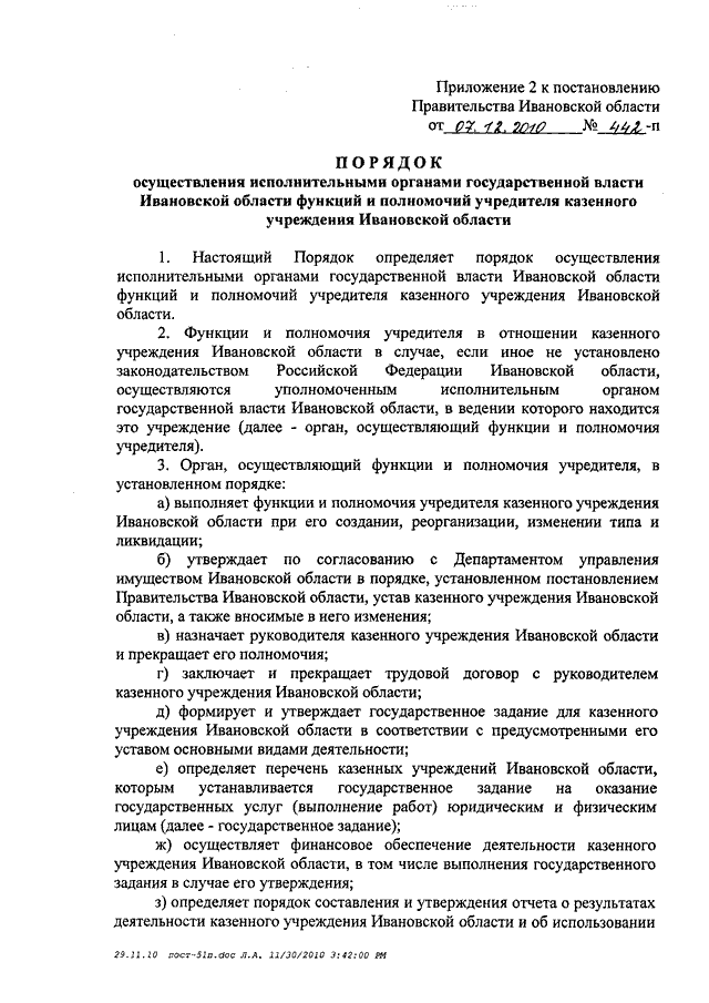 Постановление Правительства Ивановской области от 07.12.2010 N 442-п "О порядках осуществления исполнительными органами государственной власти Ивановской области функций и полномочий учредителя бюджетных и казенных учреждений Ивановской области и о внесении изменений в постановление Правительства Ивановской области от 02.04.2008 N 51-п "Об утверждении Порядка осуществления исполнительными органами государственной власти Ивановской области функций и полномочий учредителя автономного учреждения Ивановской области"
