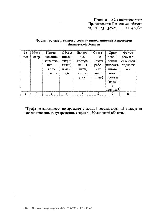 Постановление Правительства Ивановской области от 07.12.2010 N 445-п "Об утверждении Порядка заполнения и ведения государственного реестра инвестиционных проектов Ивановской области"