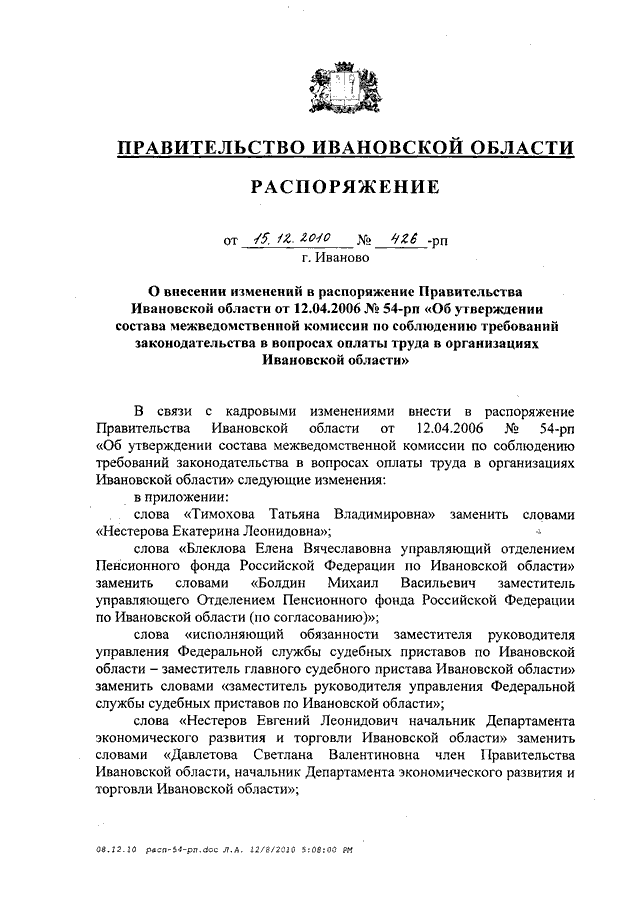 Распоряжение Правительства Ивановской области от 15.12.2010 N 426-рп "О внесении изменений в распоряжение Правительства Ивановской области от 12.04.2006 N 54-рп "Об утверждении состава межведомственной комиссии по соблюдению требований законодательства в вопросах оплаты труда в организациях Ивановской области"