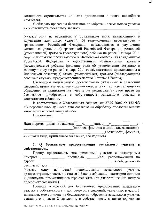 Постановление Правительства Ивановской области от 29.12.2010 N 487-п "О мерах по реализации Закона Ивановской области от 31.12.2002 N 111-ОЗ "О бесплатном предоставлении земельных участков в собственность гражданам Российской Федерации" (вместе с "Порядком учета граждан, имеющих право на бесплатное предоставление в собственность земельных участков", "Порядком бесплатного предоставления в собственность гражданам земельных участков, находящихся в собственности Ивановской области")