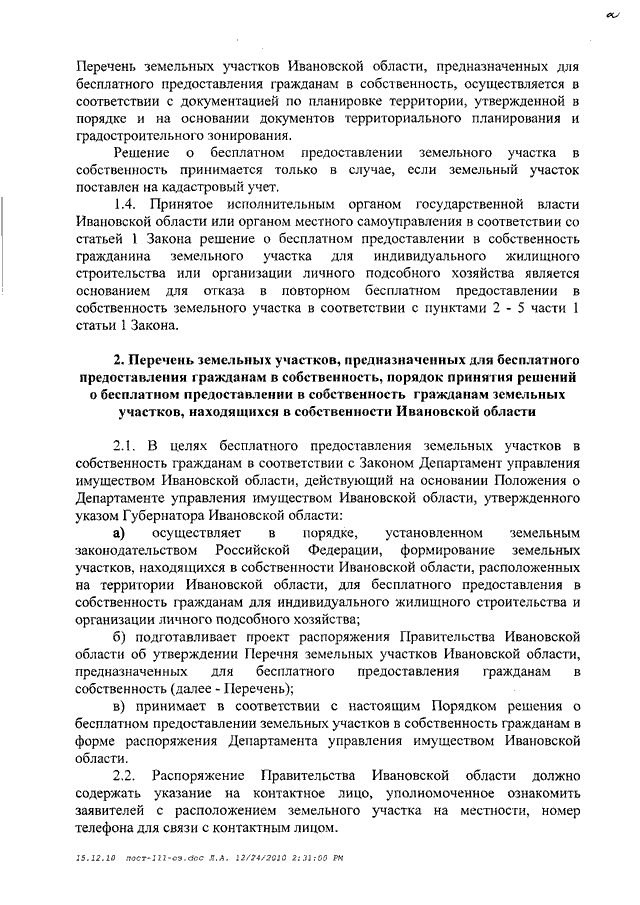 Постановление Правительства Ивановской области от 29.12.2010 N 487-п "О мерах по реализации Закона Ивановской области от 31.12.2002 N 111-ОЗ "О бесплатном предоставлении земельных участков в собственность гражданам Российской Федерации" (вместе с "Порядком учета граждан, имеющих право на бесплатное предоставление в собственность земельных участков", "Порядком бесплатного предоставления в собственность гражданам земельных участков, находящихся в собственности Ивановской области")