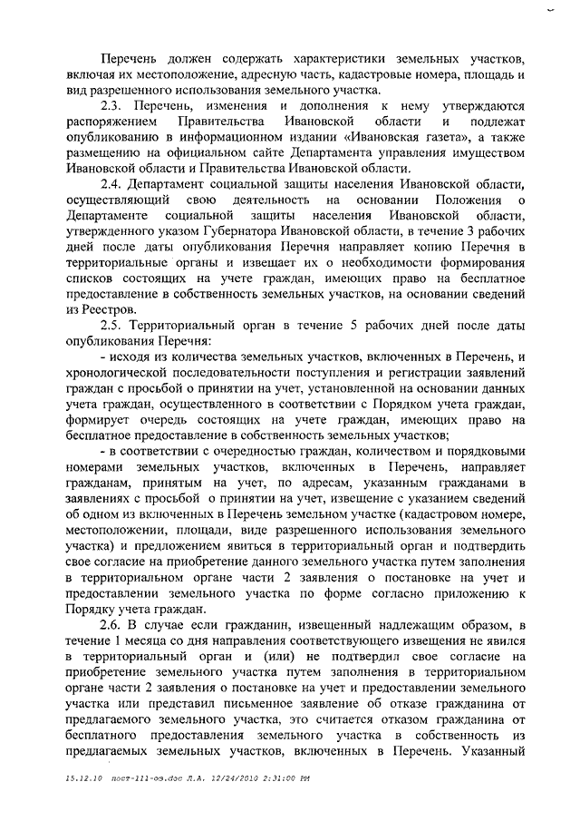 Постановление Правительства Ивановской области от 29.12.2010 N 487-п "О мерах по реализации Закона Ивановской области от 31.12.2002 N 111-ОЗ "О бесплатном предоставлении земельных участков в собственность гражданам Российской Федерации" (вместе с "Порядком учета граждан, имеющих право на бесплатное предоставление в собственность земельных участков", "Порядком бесплатного предоставления в собственность гражданам земельных участков, находящихся в собственности Ивановской области")
