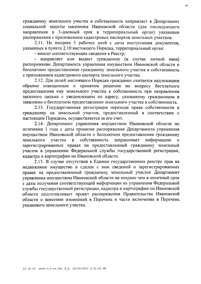 Постановление Правительства Ивановской области от 29.12.2010 N 487-п "О мерах по реализации Закона Ивановской области от 31.12.2002 N 111-ОЗ "О бесплатном предоставлении земельных участков в собственность гражданам Российской Федерации" (вместе с "Порядком учета граждан, имеющих право на бесплатное предоставление в собственность земельных участков", "Порядком бесплатного предоставления в собственность гражданам земельных участков, находящихся в собственности Ивановской области")