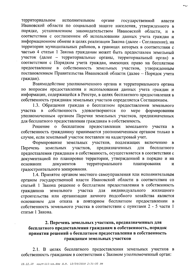 Постановление Правительства Ивановской области от 29.12.2010 N 487-п "О мерах по реализации Закона Ивановской области от 31.12.2002 N 111-ОЗ "О бесплатном предоставлении земельных участков в собственность гражданам Российской Федерации" (вместе с "Порядком учета граждан, имеющих право на бесплатное предоставление в собственность земельных участков", "Порядком бесплатного предоставления в собственность гражданам земельных участков, находящихся в собственности Ивановской области")