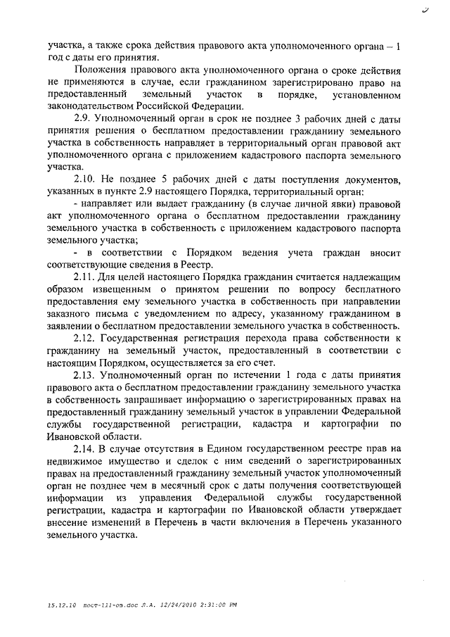Постановление Правительства Ивановской области от 29.12.2010 N 487-п "О мерах по реализации Закона Ивановской области от 31.12.2002 N 111-ОЗ "О бесплатном предоставлении земельных участков в собственность гражданам Российской Федерации" (вместе с "Порядком учета граждан, имеющих право на бесплатное предоставление в собственность земельных участков", "Порядком бесплатного предоставления в собственность гражданам земельных участков, находящихся в собственности Ивановской области")