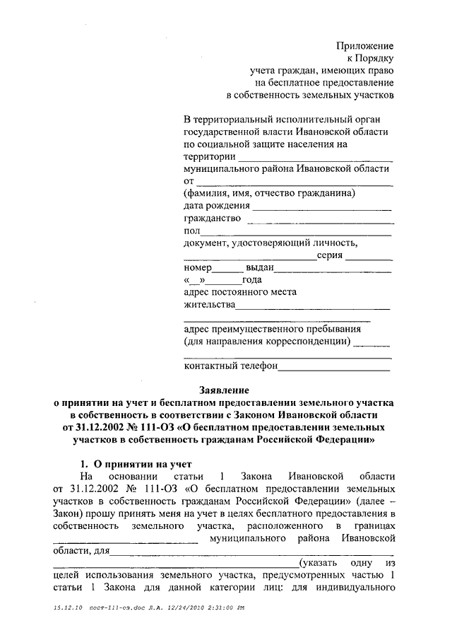 Постановление Правительства Ивановской области от 29.12.2010 N 487-п "О мерах по реализации Закона Ивановской области от 31.12.2002 N 111-ОЗ "О бесплатном предоставлении земельных участков в собственность гражданам Российской Федерации" (вместе с "Порядком учета граждан, имеющих право на бесплатное предоставление в собственность земельных участков", "Порядком бесплатного предоставления в собственность гражданам земельных участков, находящихся в собственности Ивановской области")