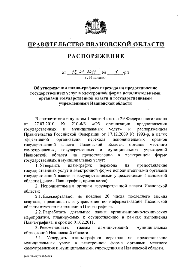 Распоряжение Правительства Ивановской области от 12.01.2011 N 1-рп "Об утверждении плана-графика перехода на предоставление государственных услуг в электронной форме исполнительными органами государственной власти и государственными учреждениями Ивановской области"