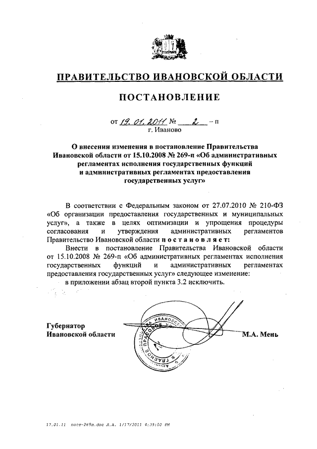 Постановление Правительства Ивановской области от 19.01.2011 N 2-п "О внесении изменения в постановление Правительства Ивановской области от 15.10.2008 N 269-п "Об административных регламентах исполнения государственных функций и административных регламентах предоставления государственных услуг"