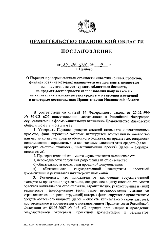 Постановление Правительства Ивановской области от 27.01.2011 N 9-п "О Порядке проверки сметной стоимости инвестиционных проектов, финансирование которых планируется осуществлять полностью или частично за счет средств областного бюджета, на предмет достоверности использования направляемых на капитальные вложения этих средств и о внесении изменений в некоторые постановления Правительства Ивановской области"