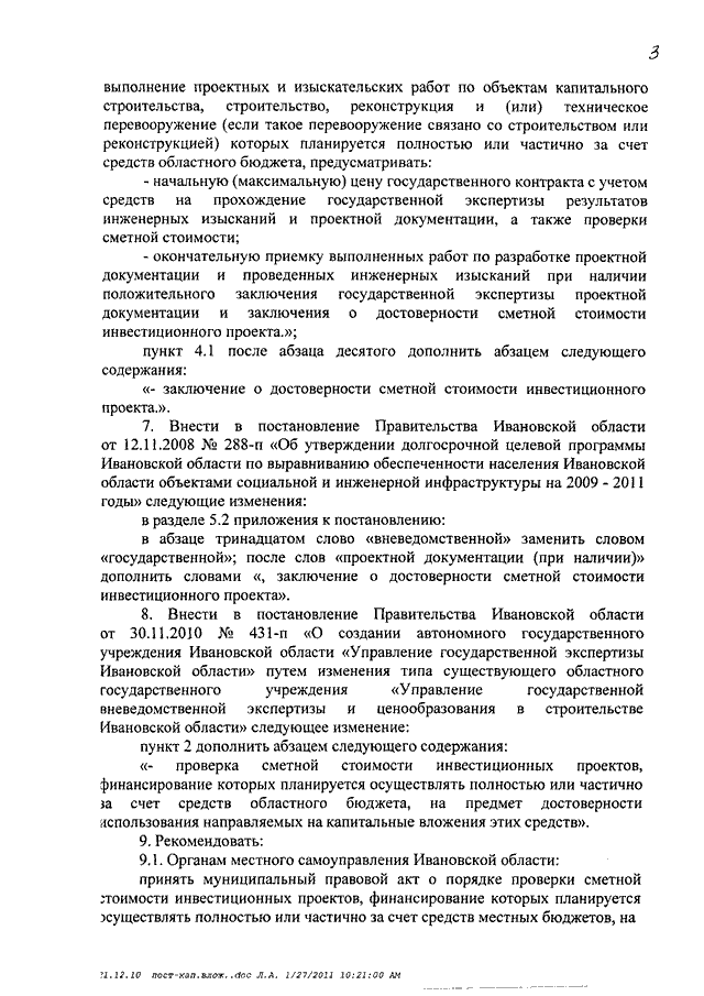 Постановление Правительства Ивановской области от 27.01.2011 N 9-п "О Порядке проверки сметной стоимости инвестиционных проектов, финансирование которых планируется осуществлять полностью или частично за счет средств областного бюджета, на предмет достоверности использования направляемых на капитальные вложения этих средств и о внесении изменений в некоторые постановления Правительства Ивановской области"