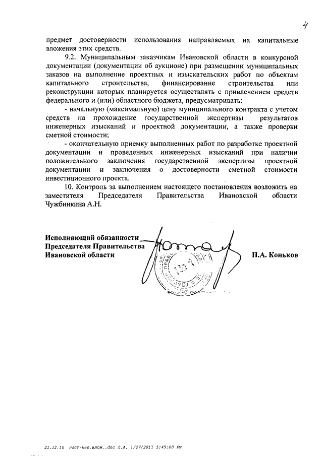 Постановление Правительства Ивановской области от 27.01.2011 N 9-п "О Порядке проверки сметной стоимости инвестиционных проектов, финансирование которых планируется осуществлять полностью или частично за счет средств областного бюджета, на предмет достоверности использования направляемых на капитальные вложения этих средств и о внесении изменений в некоторые постановления Правительства Ивановской области"