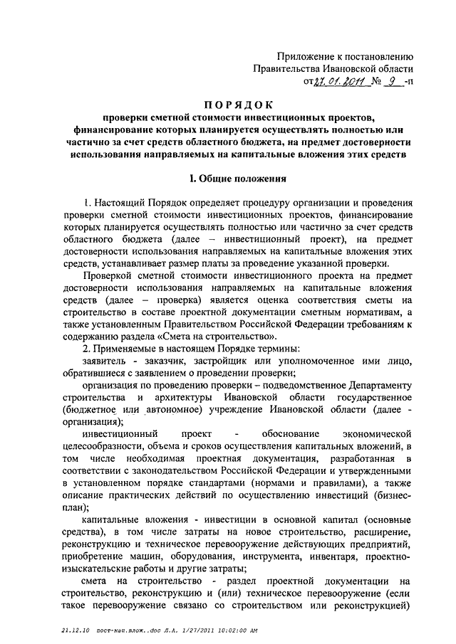 Постановление Правительства Ивановской области от 27.01.2011 N 9-п "О Порядке проверки сметной стоимости инвестиционных проектов, финансирование которых планируется осуществлять полностью или частично за счет средств областного бюджета, на предмет достоверности использования направляемых на капитальные вложения этих средств и о внесении изменений в некоторые постановления Правительства Ивановской области"
