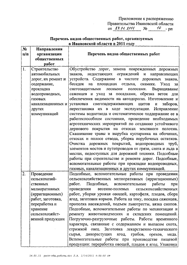 Распоряжение Правительства Ивановской области от 27.01.2011 N 10-рп "Об утверждении перечня видов общественных работ, организуемых в Ивановской области в 2011 году"