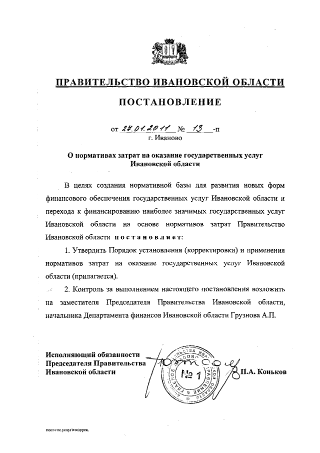 Постановление Правительства Ивановской области от 27.01.2011 N 13-п "О нормативах затрат на оказание государственных услуг Ивановской области" (вместе с "Порядком установления (корректировки) и применения нормативов затрат на оказание государственных услуг Ивановской области")