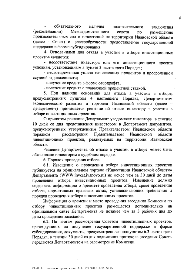 Постановление Правительства Ивановской области от 02.02.2011 N 14-п "О Порядке проведения отбора инвестиционных проектов из числа претендующих на получение государственной поддержки в форме возмещения (субсидирования) за счет средств областного бюджета части затрат на уплату процентов по кредитам, привлекаемым на инвестиционные цели в российских кредитных организациях"