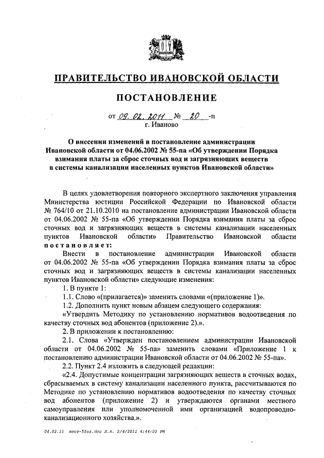 Постановление Правительства Ивановской области от 09.02.2011 N 20-п "О внесении изменений в постановление администрации Ивановской области от 04.06.2002 N 55-па "Об утверждении Порядка взимания платы за сброс сточных вод и загрязняющих веществ в системы канализации населенных пунктов Ивановской области" (вместе с "Методикой по установлению нормативов водоотведения по качеству сточных вод абонентов")