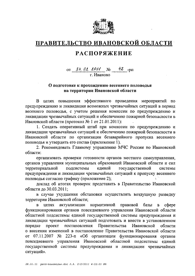 Распоряжение Правительства Ивановской области от 24.02.2011 N 42-рп "О подготовке к прохождению весеннего половодья на территории Ивановской области" (вместе с "Графиком проверок готовности органов местного самоуправления муниципальных образований Ивановской области и сил территориальной подсистемы единой государственной системы предупреждения и ликвидации чрезвычайных ситуаций к пропуску весеннего половодья")